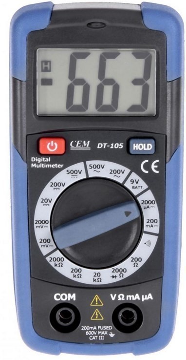 Портативный цифровой мультиметр СЕМ DT-105 оснащается быстроплавким предохранителем, который исключает выход прибора из строя вследствие перегрузки. Снятые показания выводятся на ЖК-экран в числовом формате. Сфера применения мультиметра - диагностика уровня напряжения, силы постоянного тока, сопротивления, а также проверка диодов, батарей 9В и непрерывности электролиний.